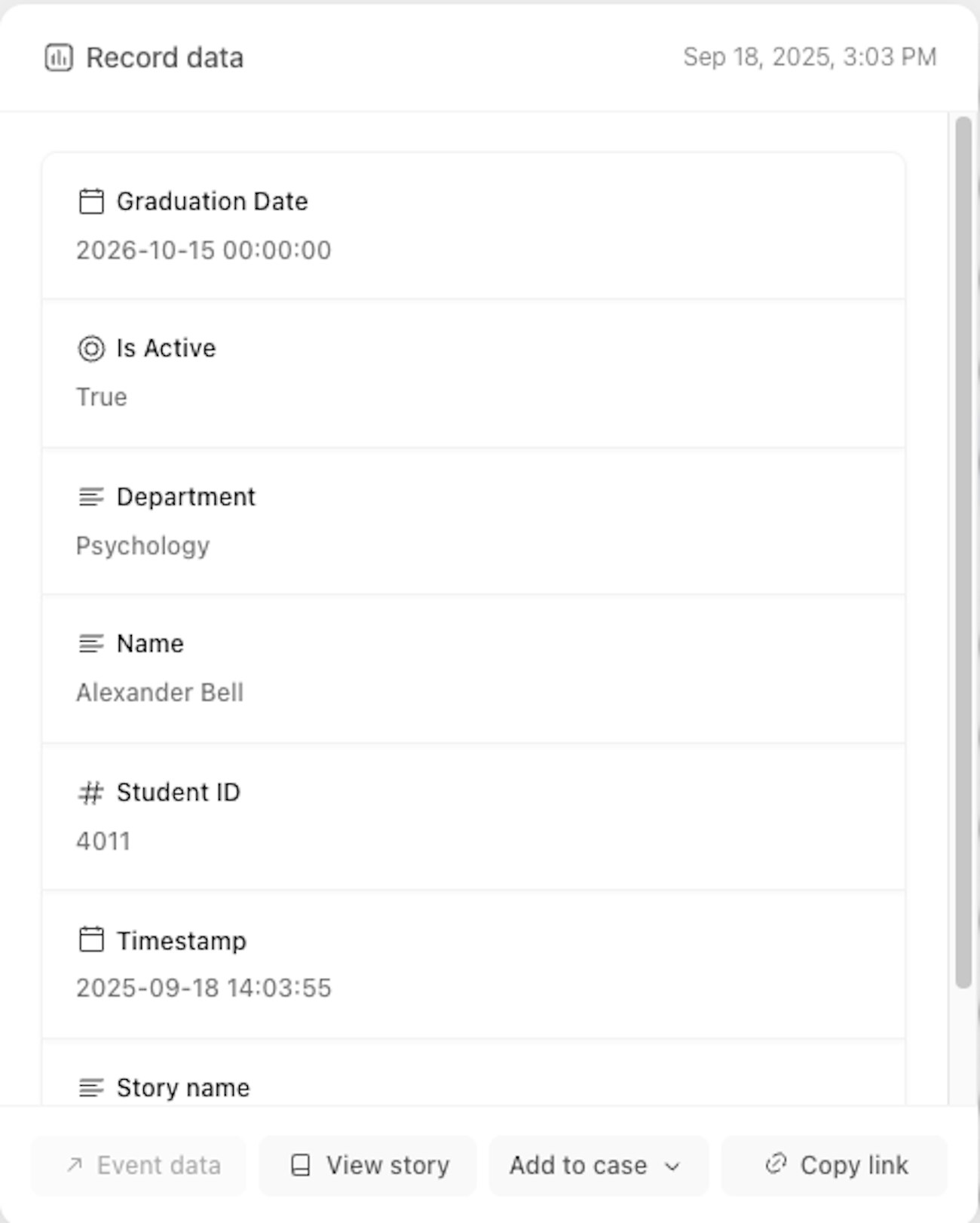 An individual record's detail view showing field values, timestamp, and the story that captured it.