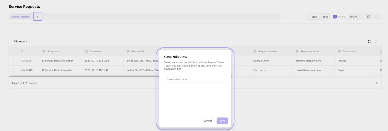 Views are saved configurations that preserve your filter settings, column arrangements, and display preferences for a specific record type. Instead of recreating the same filters and layout every time you need a particular perspective on your data, you can save it as a view and switch to it instantly.