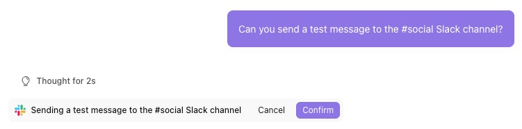 A tool confirmation prompt in Workbench showing the tool name, input details, and Confirm and Cancel buttons.