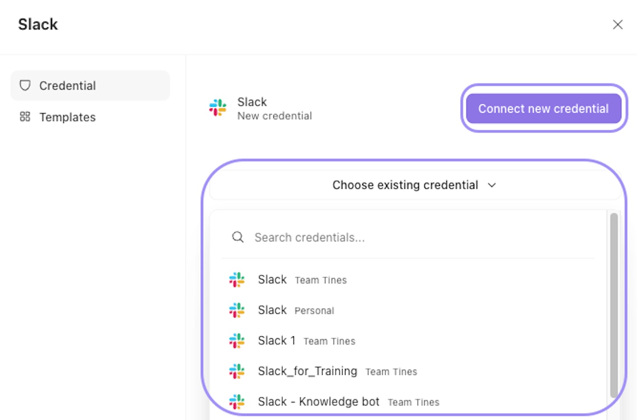 All templates require credentials to connect to external services. When you select one, you'll need to either choose an existing credential or create a new one: