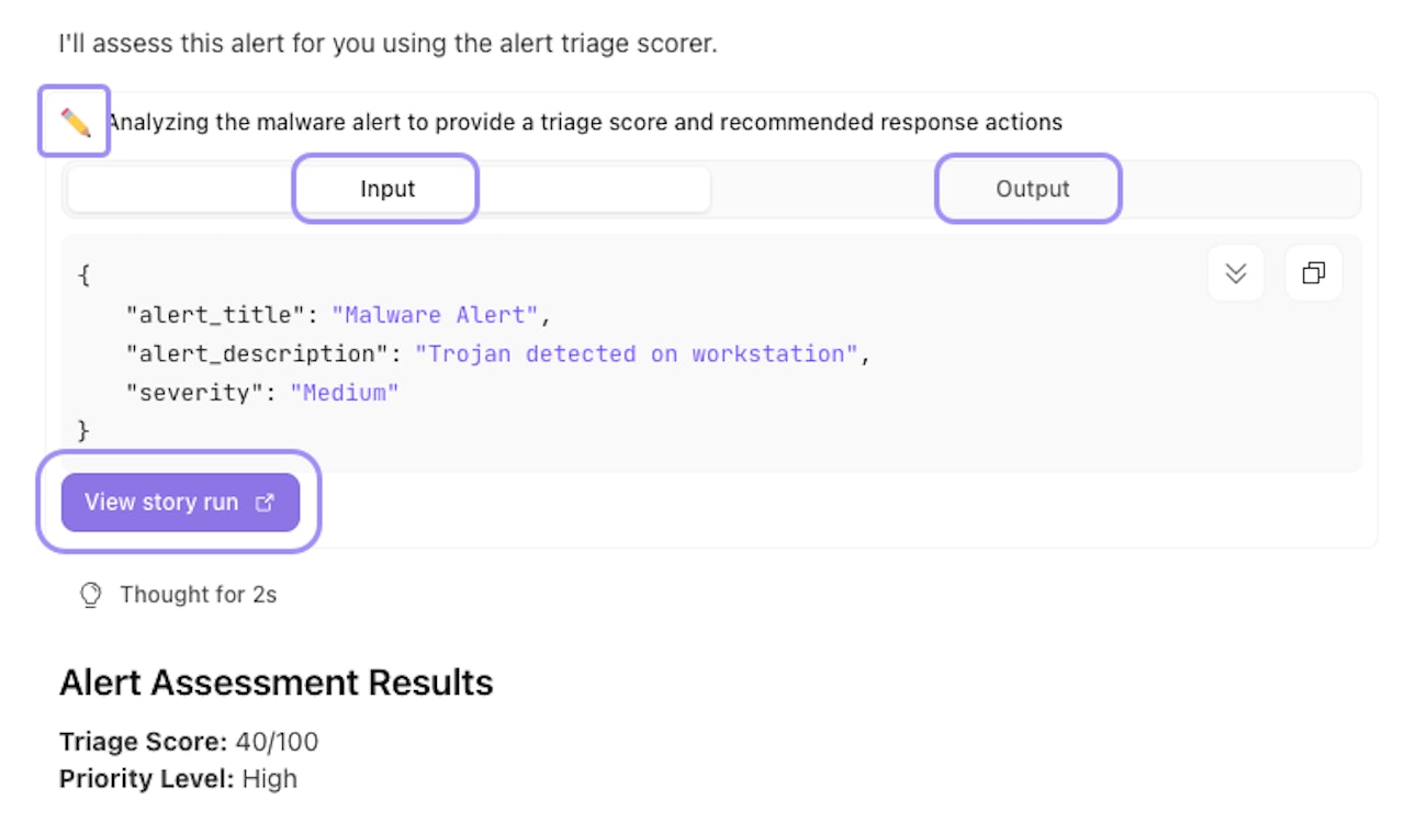 To view JSON, look for the pencil icon next to tool executions in your conversation. You can also click View story run from there to see the full story run details.
