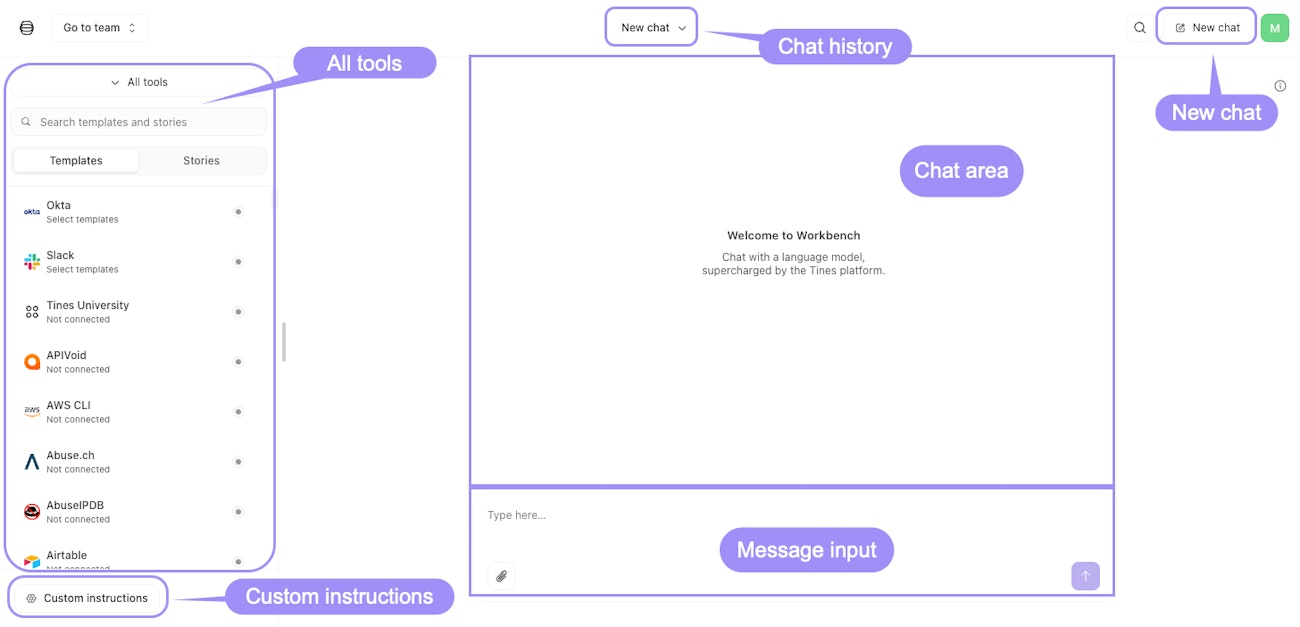 Chat area: The main conversation space where you interact with Workbench.
