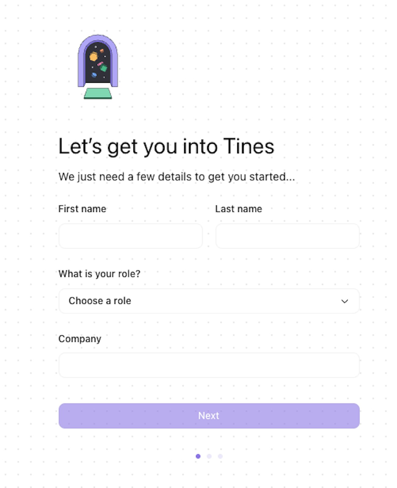 Once you sign up, you will be redirected to your free Community Edition Tines tenant! The URL of your tenant will resemble this: https://generated-name.tines.com. You will be greeted with the welcome page, where you will input your information: